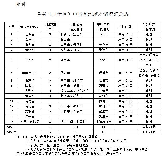 現(xiàn)我局按截止時(shí)間對(duì)相關(guān)。ㄗ灾螀^(qū))發(fā)展改革委(能源局)申報(bào)文件進(jìn)行了統(tǒng)計(jì)和初步形式審查。截至10月31日,共有15個(gè)。ㄗ灾螀^(qū))向我局正式提交了共37個(gè)光伏發(fā)電領(lǐng)跑基地申報(bào)材料,其中包含23個(gè)應(yīng)用領(lǐng)跑基地和14個(gè)技術(shù)領(lǐng)跑基地;共有14個(gè)。ㄗ灾螀^(qū))的34個(gè)光伏發(fā)電領(lǐng)跑基地通過了初步形式審查,其中包含21個(gè)應(yīng)用領(lǐng)跑基地和13個(gè)技術(shù)領(lǐng)跑基地。為保障領(lǐng)跑基地優(yōu)選工作公平、公正、公開,現(xiàn)按類別對(duì)申報(bào)基地的基本情況予以公開。