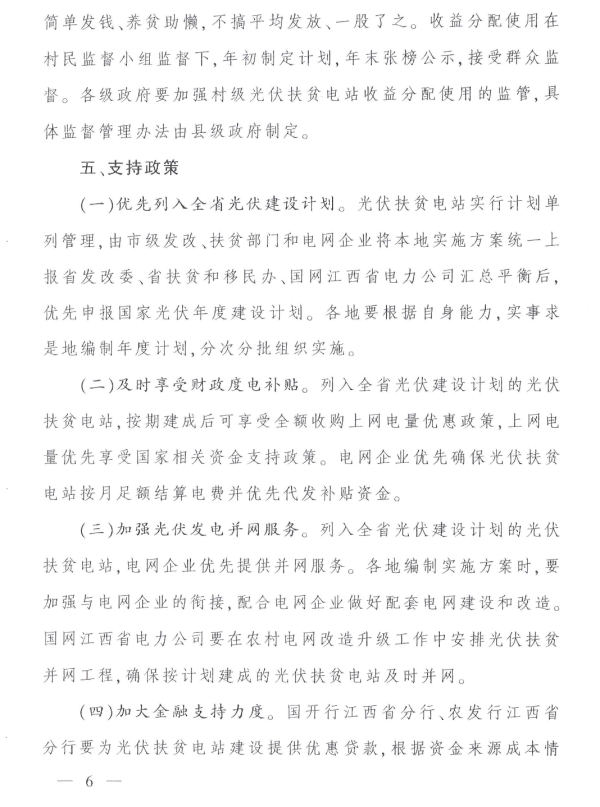 第五部分,關(guān)于支持?jǐn)U面工程實(shí)施的優(yōu)惠政策,為推進(jìn)光伏扶貧擴(kuò)面工程的順利高效實(shí)施,從建設(shè)指標(biāo)、度電補(bǔ)貼、電網(wǎng)接入、金融支持、保障用地這五方面分別提出了支持政策,為村級(jí)扶貧電站助力脫貧攻堅(jiān)鋪平了道路。