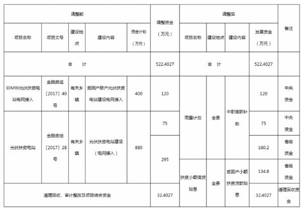 經(jīng)縣脫貧攻堅(jiān)領(lǐng)導(dǎo)小組研究,決定調(diào)整《金寨縣2017年第二批財(cái)政專項(xiàng)扶貧資金項(xiàng)目計(jì)劃》中“光伏扶貧電站”項(xiàng)目計(jì)劃、《金寨縣2017年第三批財(cái)政專項(xiàng)扶貧資金項(xiàng)目計(jì)劃》中“30MW光伏扶貧電站電網(wǎng)接入”項(xiàng)目計(jì)劃及重新安排清理回收資金項(xiàng)目計(jì)劃(詳見附表)。