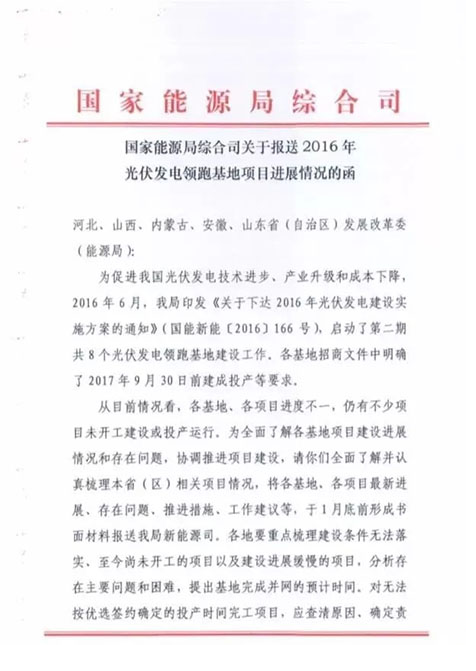 國家能源局要求報送2016年光伏發(fā)電領跑基地項目進展情況