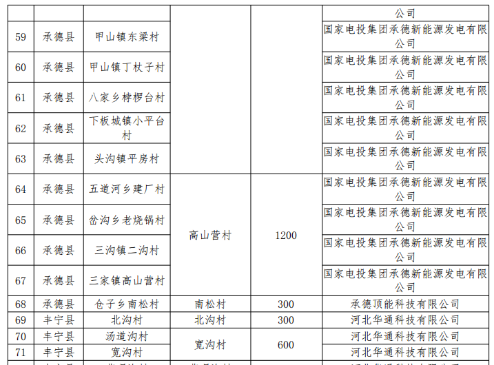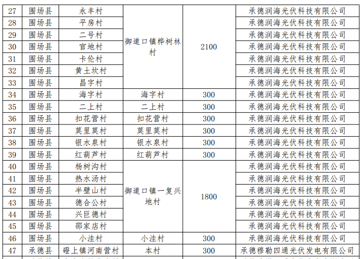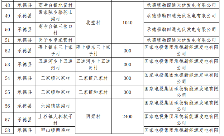五、同意承德縣村級光伏扶貧電站建設(shè)企業(yè)由承德穆勒四通光伏發(fā)電有限公司變更為承德穆勒四通光伏發(fā)電有限公司、國家電投集團(tuán)承德新能源發(fā)電有限公司、承德頂能科技有限公司3家企業(yè)。同意劉杖子鄉(xiāng)小西營村、南大洼村、孟家莊村、鞍匠鎮(zhèn)后溝村4個村級光伏扶貧電站項(xiàng)目變更為高寺臺鎮(zhèn)北堂村、三家鎮(zhèn)高山營村、三家鎮(zhèn)興家村、五道河鄉(xiāng)上五道河村4個村級光伏扶貧電站項(xiàng)目,建設(shè)地點(diǎn)位于本村,規(guī)模不變;孟家院鄉(xiāng)駱駝山溝村、高寺臺鎮(zhèn)三岔口村、崗子鄉(xiāng)李家營村與高寺臺鎮(zhèn)北堂村采取4村聯(lián)建、分村備案的方式,建設(shè)地點(diǎn)變更為高寺臺鎮(zhèn)北堂村,裝機(jī)規(guī)模1040千瓦;五道河鄉(xiāng)建廠村、岔溝鄉(xiāng)老燒鍋村、三溝鎮(zhèn)二溝村與三家鎮(zhèn)高山營村采取4村聯(lián)建、分村備案的方式,建設(shè)地點(diǎn)變更為三家鎮(zhèn)高山營村,裝機(jī)規(guī)模1200千瓦。六溝鎮(zhèn)跳溝村、上谷鎮(zhèn)大郭杖子村、甲山鎮(zhèn)東梁村、甲山鎮(zhèn)丁杖子村、八家鄉(xiāng)桲欏臺村、下板城鎮(zhèn)小平臺村、頭溝鎮(zhèn)平房村與甲山鎮(zhèn)西梁村采取8村聯(lián)建、分村備案的方式,建設(shè)地點(diǎn)變更為甲山鎮(zhèn)西梁村,裝機(jī)規(guī)模2400千瓦。