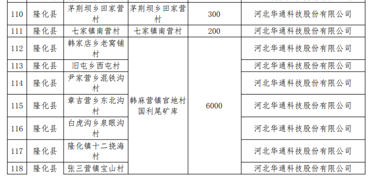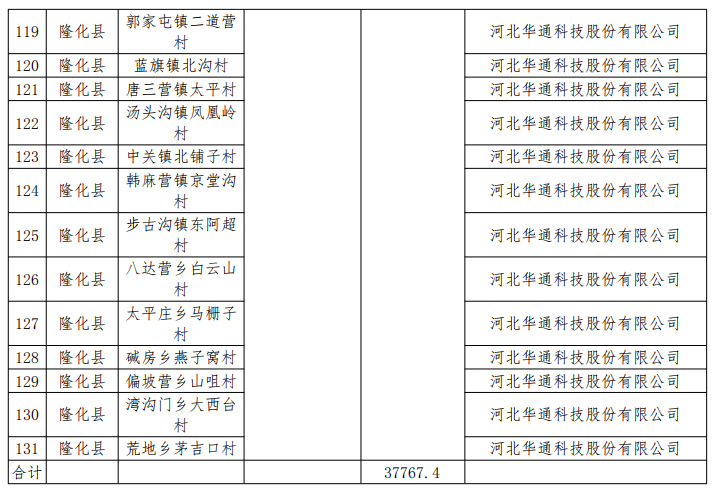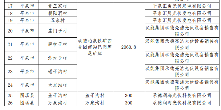 四、同意隆化縣村級光伏扶貧電站建設(shè)企業(yè)由河北華通科技股份有限公司和常州天合光伏發(fā)電系統(tǒng)有限公司變更為全部由河北華通科技股份有限公司1家企業(yè)建設(shè)。同意隆化鎮(zhèn)十二撓海村、張三營鎮(zhèn)寶山村、郭家屯鎮(zhèn)二道營村、藍(lán)旗鎮(zhèn)北溝村、唐三營鎮(zhèn)太平村、湯頭溝鎮(zhèn)鳳凰嶺村、中關(guān)鎮(zhèn)北鋪?zhàn)哟、韓麻營鎮(zhèn)京堂溝村、步古溝鎮(zhèn)東阿超村、韓家店鄉(xiāng)老窩鋪村、舊屯鄉(xiāng)西屯村、尹家營鄉(xiāng)混鐵溝村、章吉營鄉(xiāng)東北溝村、白虎溝鄉(xiāng)泉眼溝村、八達(dá)營鄉(xiāng)白云山村、太平莊鄉(xiāng)馬柵子村、堿房鄉(xiāng)燕子窩村、偏坡營鄉(xiāng)山咀村、灣溝門鄉(xiāng)大西臺村、荒地鄉(xiāng)茅吉口村等20村聯(lián)建,分村備案,建設(shè)地點(diǎn)變更為韓麻營鎮(zhèn)官地村國利尾礦庫,裝機(jī)規(guī)模6000千瓦。