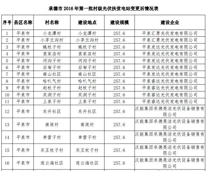 附件:承德市2016年第一批村級光伏扶貧電站變更后情況表