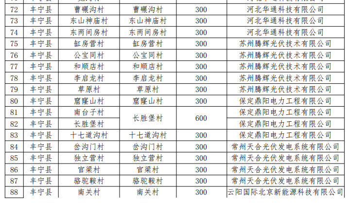 六、同意豐寧滿族自治縣村級光伏扶貧電站建設(shè)企業(yè)由豐寧滿族自治縣大元國控有限公司變更為河北華通科技有限公司、蘇州騰暉光伏技術(shù)有限公司、保定鼎陽電力工程有限公司、常州天合光伏發(fā)電系統(tǒng)有限公司、云陽國際北京新能源科技有限公司5家企業(yè)。同意石人溝鄉(xiāng)湯道溝村村級電站項(xiàng)目采取和石人溝鄉(xiāng)寬溝村2村聯(lián)建、分村備案的方式,建設(shè)地點(diǎn)變更為石人溝鄉(xiāng)寬溝村,裝機(jī)規(guī)模600千瓦;五道營鄉(xiāng)南臺子村村級電站項(xiàng)目和五道營鄉(xiāng)長勝堡村2村聯(lián)建、分村備案,建設(shè)地點(diǎn)變更為五道營鄉(xiāng)長勝堡村,裝機(jī)規(guī)模600千瓦。