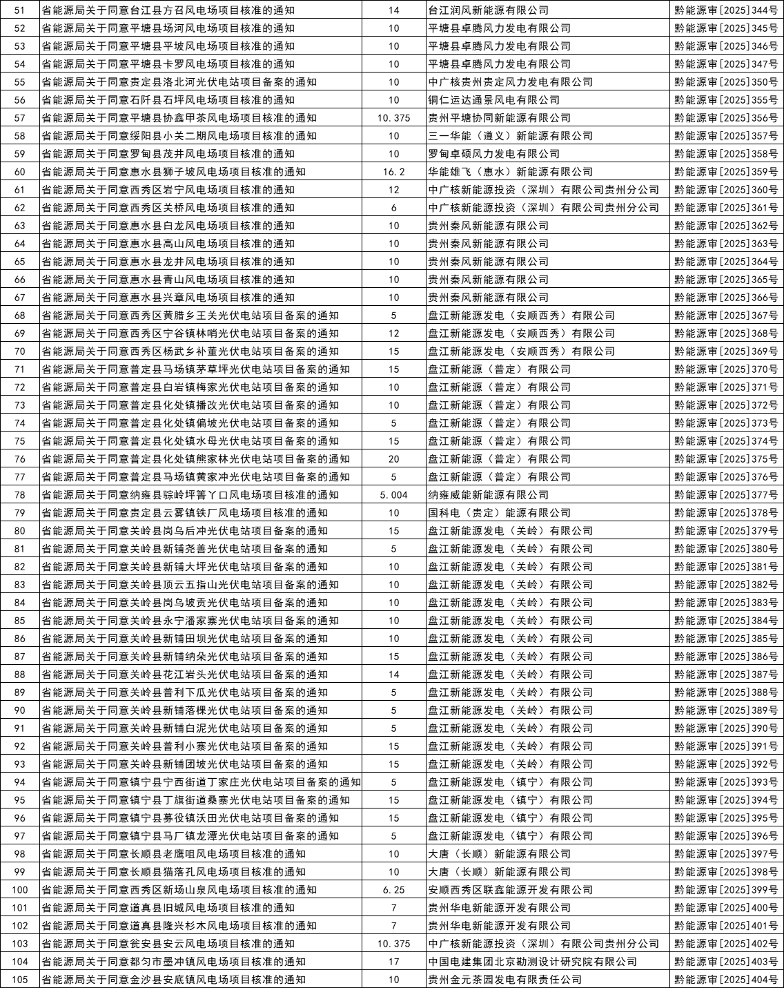 1月15日,貴州省能源局發(fā)布公告,根據(jù)《省人民政府關(guān)于印發(fā)貴州省企業(yè)投資項(xiàng)目核準(zhǔn)和備案管理辦法的通知》(黔府發(fā)〔2018〕第7號(hào)),按照程序,貴州省能源局2025年10月-2025年12月核準(zhǔn)備案風(fēng)電、光伏發(fā)電項(xiàng)目105個(gè),現(xiàn)將有關(guān)情況公布如下: