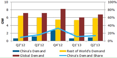 圖一、Q2’12-Q2’13全球與中國光伏需求