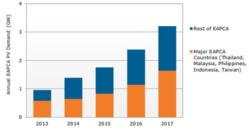 亞太和中亞地區(qū)太陽能需求主要來自泰國、馬來西亞、菲律賓、印度尼西亞和臺灣。在2013-2017年間,預計這五個國家將占太陽能總需求的50%。