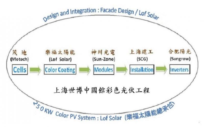 此243KW彩色光伏系統(tǒng)由臺(tái)灣樂福太陽能公司為總承包。光伏系統(tǒng)則由加拿大Façade Design and Development 公司設(shè)計(jì),設(shè)計(jì)師是黃乃哲。高效率藍(lán)色太陽電池系由臺(tái)灣最有名的茂迪公司提供,而由臺(tái)灣樂福來著色,本案能為世博局選中,其關(guān)鍵在于樂福公司發(fā)展出全世界唯一有專利的技術(shù),可在高效率藍(lán)色單晶/多晶太陽電池片上鍍制各種色彩,而其效率減損甚為微小,而一般其他著色的方法,其太陽電池效率的衰減可達(dá)20~30%以上(表一)。彩色太陽能電池再交由精選的湖南長(zhǎng)沙神州光電公司制成2750塊雙玻模塊,然后運(yùn)抵「上海建工」裝框后組裝完竣。其中所采用的8臺(tái)30KW的逆變器系統(tǒng)則由合肥陽光公司所提供。