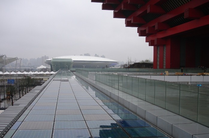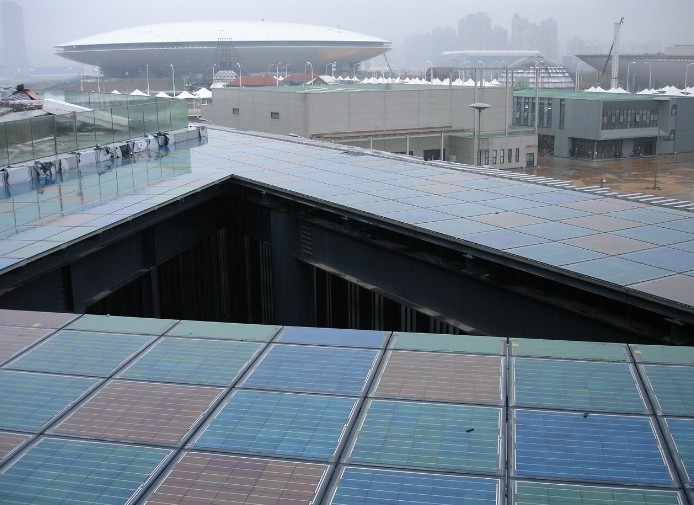 環(huán)繞此五萬平方米的園林有周長(zhǎng)逾一公里的「女兒墻」,其上有樂福公司建造的243KW之「高效率彩色太陽電池系統(tǒng)」,此系統(tǒng)提供主建筑及其園林下方五萬平方米(內(nèi)設(shè)中國(guó)31省市館)所需20%的照明及部份空調(diào)所需的電力,此系「上網(wǎng)」而不「并網(wǎng)」,不足的電力則由電網(wǎng)供應(yīng)。圖二顯示部份宏偉結(jié)構(gòu)的女兒墻(為光伏工程施工前)。圖三顯示此光伏系統(tǒng)所使用的光伏板塊,此即是紅綠藍(lán)(Tile red,Meadow green及Lake cyan)。圖四顯示此彩色太陽能電池系統(tǒng)的一景,遠(yuǎn)處所示為占地一千平方米尚未完工的「臺(tái)灣館」。圖五為此系統(tǒng)的另一景。