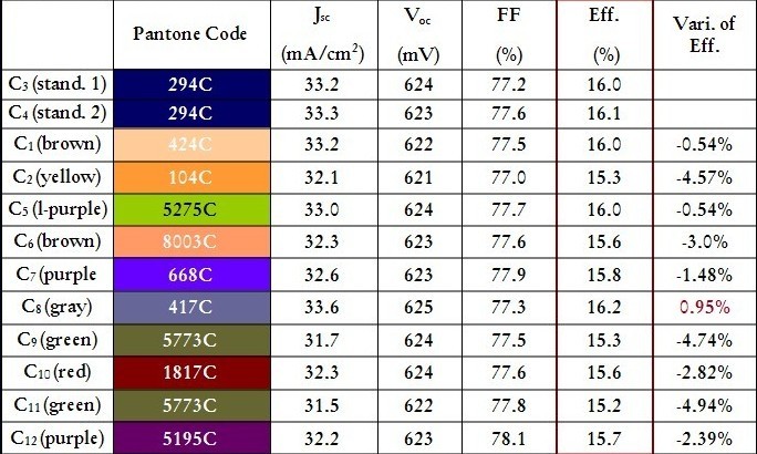 <表一>樂福公司彩色太陽能電池效率及其變化一欄(以藍(lán)色為基準(zhǔn))