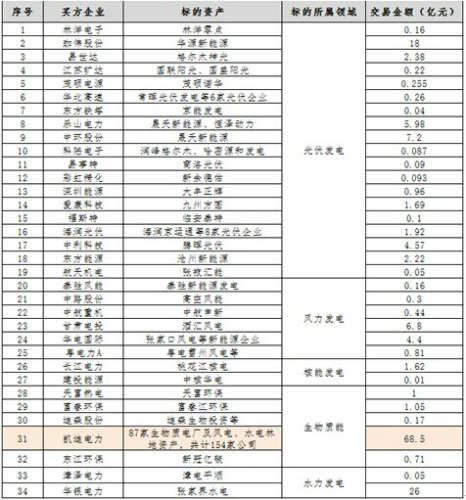 其中,上周剛剛公告重組預(yù)案復(fù)牌的凱迪電力尤其引人注意,11月25日晚間公司發(fā)布公告稱:擬通過(guò)發(fā)行股份及支付現(xiàn)金方式,購(gòu)買控股股東及關(guān)聯(lián)方及無(wú)關(guān)聯(lián)第三方合計(jì)15名交易方持有的生物質(zhì)發(fā)電資產(chǎn)、風(fēng)電、水電及林地資產(chǎn),交易涉及包括87家生物質(zhì)電廠和58家林業(yè)公司在內(nèi)的154家公司,無(wú)論從并購(gòu)規(guī)模還是并購(gòu)金額來(lái)看,都是本年度目前新能源領(lǐng)域最大的并購(gòu)事件,涉及資產(chǎn)規(guī)模占年內(nèi)布局新能源領(lǐng)域總金額的43%。