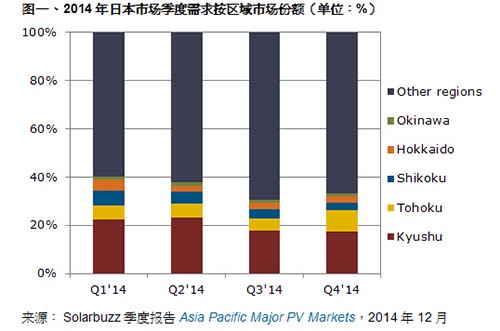 Solarbuzz分析師胡丹指出:“雖然在三季度末,日本五個(gè)區(qū)域電力公司提出對(duì)非居民項(xiàng)目的并網(wǎng)審批暫停,但我們認(rèn)為仍不會(huì)顯著影響2015年日本市場(chǎng)需求,主要原因是已經(jīng)獲批的光伏儲(chǔ)備項(xiàng)目量較大,并且這些項(xiàng)目不受暫停并網(wǎng)審批的影響!睋(jù)統(tǒng)計(jì)2014年這五個(gè)區(qū)域電力公司的光伏裝機(jī)需求約占整個(gè)日本市場(chǎng)的35%左右。
