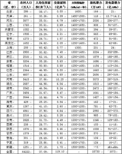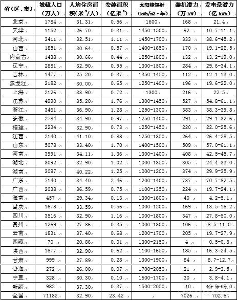 有鑒于此,我們“不得已”而采取了一種測算方法,利用已有相關(guān)統(tǒng)計數(shù)據(jù),對全國可用居民屋頂面積進(jìn)行估算,進(jìn)而得到分布式光伏開發(fā)潛力;舅悸肥牵焊鶕(jù)國家統(tǒng)計局公布的2012年全國城鎮(zhèn)人口和農(nóng)村人口,按照當(dāng)年城鎮(zhèn)及農(nóng)村人口人均住房建筑面積,得到全國屋頂總面積,考慮20%的屋頂面積具備安裝分布式光伏設(shè)施條件,從而得到可利用屋頂面積。按照每平方米可安裝光伏裝機容量150瓦,可以推算出分布式光伏總裝機容量,再根據(jù)各省(區(qū)、市)太陽輻照強度推算出滿負(fù)荷利用小時數(shù),最后得到各地區(qū)分布式光伏潛在發(fā)電量。