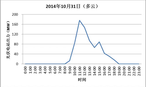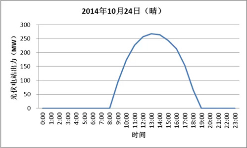 光伏電站出力受太陽能資源的影響,具有規(guī)律性和波動性,格爾木地區(qū)光伏電站出力基本上分布在7:00~20:00,最大出力出現(xiàn)在12:00~15:00。陰天光伏電站出力波動較大,全年最大出力達到283.7MW,接近滿發(fā)。