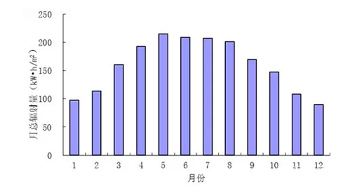 格爾木地區(qū)多年太陽能年總輻射量約在1800kwh/m2~1998kwh//m2之間,多年平均月總輻射量在89.6~214.7kWh/m2之間,其中5月份最高,12月份最低。
