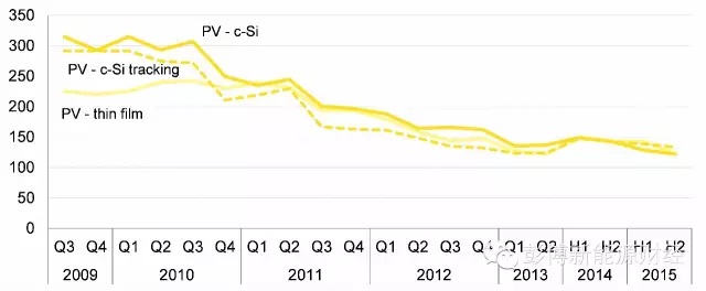 ● 全球固定運維(O&M)預(yù)期也對下降起到助推作用,因為非跟蹤晶體硅固定成本從2015年上半年的31,670美元/兆瓦/年降至30,153美元/兆瓦/年。