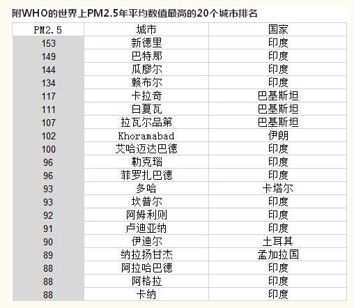 根據(jù)世界衛(wèi)生組織2014年公布的數(shù)據(jù),全球空氣污染最嚴(yán)重的20個(gè)城市中,有13個(gè)是印度城市。其中,印度城市新德里、巴特那、瓜繆爾、賴布爾位列前四。