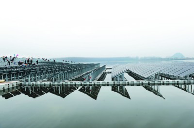 近日,信義光能公司組織工人在淮南市謝家集區(qū)采煤沉陷區(qū)水面上安裝太陽(yáng)能光伏板。