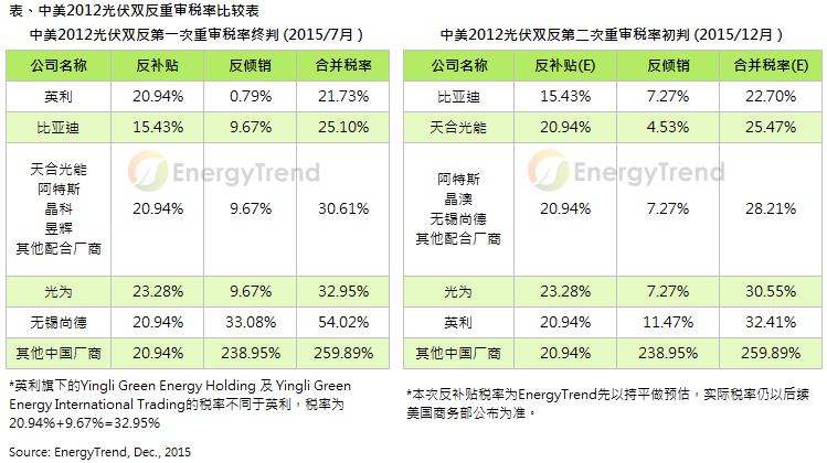 2012年中美雙反第一次重審剛于今年七月落幕,第二次重審又來(lái)勢(shì)洶洶,近期可能將公布初判結(jié)果,終判則在2016年年中才能塵埃落定。TrendForce旗下新能源事業(yè)處EnergyTrend觀察,目前初判進(jìn)度僅在反傾銷的部份有初步定論,如依預(yù)估5%左右的稅率降幅來(lái)看,天合光能將成大贏家,穩(wěn)定在美國(guó)的市占率,臺(tái)廠茂迪則失去稅率優(yōu)勢(shì),沖擊茂迪間接美國(guó)訂單的量?jī)r(jià)。至于反補(bǔ)貼部分極有可能維持平盤。