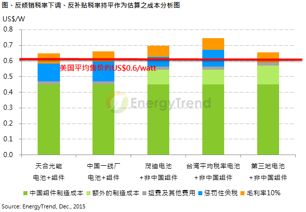 由于陸廠稅率偏高、且第三地電池產(chǎn)能稀少,2015年讓不少大廠多以茂迪的電池片至第三地代工廠封成組件,茂迪因此吃足了稅率優(yōu)勢(shì)的甜頭,整年度出貨暢旺。茂迪間接往美國(guó)的訂單價(jià)格比其余臺(tái)廠高了起碼US$0.1/W以上,尤其下半年美國(guó)訂單火熱,更讓茂迪的美國(guó)訂單最高超過了US$0.355/W,約達(dá)15%左右的毛利潤(rùn)。