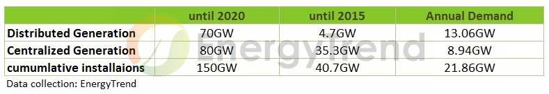 中國(guó)國(guó)家能源局發(fā)出“十三五”的太陽能利用意見稿,當(dāng)中明文指出“十三五”太陽能光伏裝機(jī)目標(biāo)為150GW,包含70GW的分布式光伏以及80GW的集中式光伏電站。EnergyTrend估計(jì),若需達(dá)成此目標(biāo),則中國(guó)未來五年內(nèi)平均每年的光伏設(shè)備需求量將突破20GW。但此目標(biāo)是否可行,仍待檢驗(yàn)。