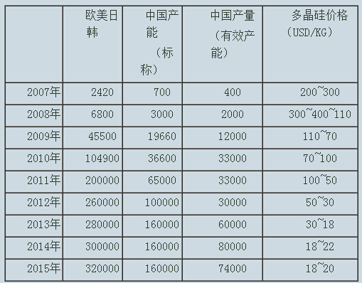 表1 2007~2015年全球太陽能級多晶硅產(chǎn)量和地區(qū)分布(產(chǎn)量:噸)