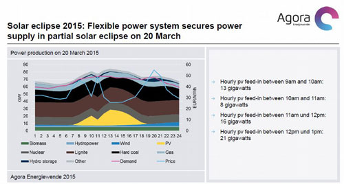 2015年3月20日出現(xiàn)日偏食,考驗了隨光伏發(fā)電的輸出降低,德國整體電力系統(tǒng)的應(yīng)對能力。當(dāng)時以全電力系統(tǒng)應(yīng)對,維持了供需平衡。能應(yīng)對風(fēng)力發(fā)電和光伏發(fā)電輸出變動的靈活性有了進一步提高。