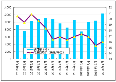 圖1 2015年1月-2016年1月多晶硅進(jìn)口量及進(jìn)口均價(jià)示意圖數(shù)據(jù)來(lái)源:海關(guān)