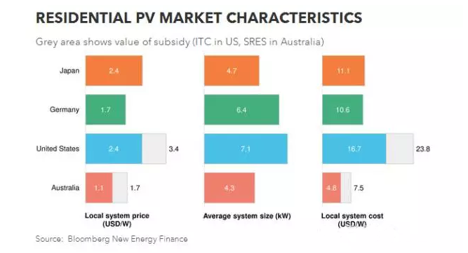 目前,美國住宅光伏系統(tǒng)的成本大約是其他成熟市場的2倍。客戶的購得成本、獲準成本、其他軟成本,以及金融產品的成本都會使小型光伏系統(tǒng)的價格高居不下。