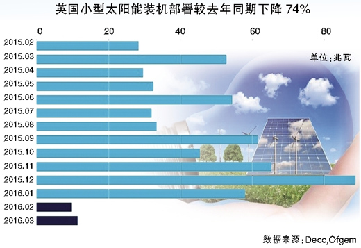 補(bǔ)貼削減致裝機(jī)下降 英國能源部于去年巴黎氣候大會達(dá)成歷史性協(xié)議之后迅速宣布了新的光伏補(bǔ)貼政策,提出削減太陽能上網(wǎng)電價補(bǔ)貼65%,而這正是支持商業(yè)屋頂光伏和小型光伏發(fā)電廠的一項關(guān)鍵性補(bǔ)助。盡管相較去年夏季原本計劃的87%削減幅度稍有下降,但對光伏項目補(bǔ)貼支持的減少令積極推動清潔能源發(fā)展的環(huán)保人士倍感沮喪。