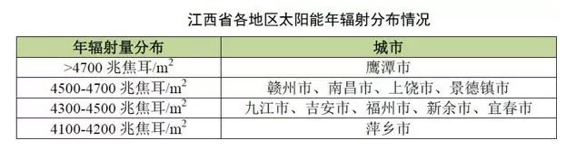 2,按照中國氣象局制定的太陽能資源評估標(biāo)準(zhǔn),屬于太陽能資源豐富帶,可進(jìn)行一定規(guī)模的開發(fā)利用。江西省環(huán)鄱陽湖區(qū)和贛州地區(qū)的東北部為太陽能資源最豐富區(qū),年總輻射量在4500兆焦耳/m