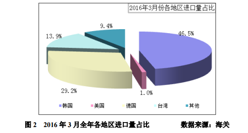 根據(jù)海關(guān)最新數(shù)據(jù)統(tǒng)計,2016年3月份我國多晶硅進(jìn)口量創(chuàng)歷史新高,達(dá)到13866噸,環(huán)比增加33.7%,一季度累計進(jìn)口多晶硅36625噸,同比增加34.8%。導(dǎo)致3月份進(jìn)口總量創(chuàng)歷史新高的原因有:第一,3月份從韓國進(jìn)口量創(chuàng)歷史新高達(dá)到6443噸,環(huán)比增加37.1%,比當(dāng)月從美國、德國、臺灣進(jìn)口總量還超出5%,在總進(jìn)口量中維持46.5%的高位,仍然保持最大進(jìn)口來源地;第二,3月份從德國進(jìn)口量創(chuàng)歷史新高達(dá)到4054噸,環(huán)比大幅增加75.5%,占總進(jìn)口量的29.2%,較2015年2月份的進(jìn)口最低位增加了近一倍多;第三,3月份從臺灣進(jìn)口多晶硅同樣創(chuàng)歷史新高達(dá)到1929噸,環(huán)比增加46.5%,位居我國第三大進(jìn)口地區(qū)。綜上,自韓國、德國、臺灣進(jìn)口量齊創(chuàng)新高,是致使3月份多晶硅進(jìn)口量躍居歷史高位的直接因素。