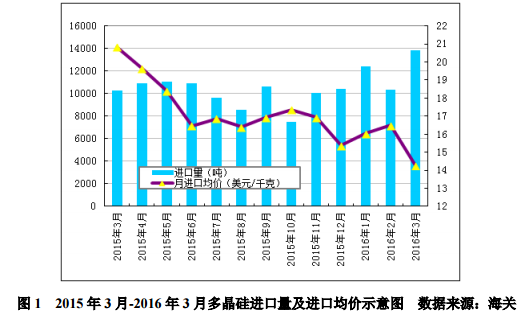 自韓、德、臺進(jìn)口量齊創(chuàng)新高,美國多晶硅價格再度下跌。根據(jù)海關(guān)最新數(shù)據(jù)統(tǒng)計,2016年3月份我國多晶硅進(jìn)口量創(chuàng)歷史新高,達(dá)到13866噸,環(huán)比增加33.7%,一季度累計進(jìn)口多晶硅36625噸,同比增加34.8%。