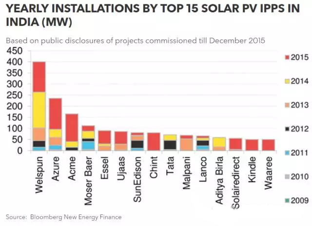 獨(dú)立電廠(IPP)擁有能源資產(chǎn),可以向用電單位與其他電網(wǎng)用戶出售電力產(chǎn)出。自2009年起,印度的獨(dú)立電廠一直在豐富旗下光伏項(xiàng)目的類(lèi)型。這些獨(dú)立電廠中既有專(zhuān)營(yíng)獨(dú)立電廠,也有大型企業(yè)集團(tuán)下的電力部門(mén)。截止至2015年12月,印度Top 15獨(dú)立光伏電廠總共擁有的服役容量已達(dá)1.7GW,占印度整個(gè)光伏市場(chǎng)的35%。