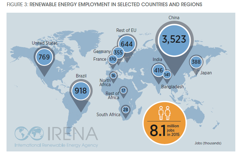 國家和地區(qū)可再生能源行業(yè)就業(yè)人數(shù)概況(資料來源:IRENA報(bào)告)