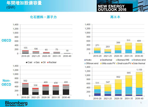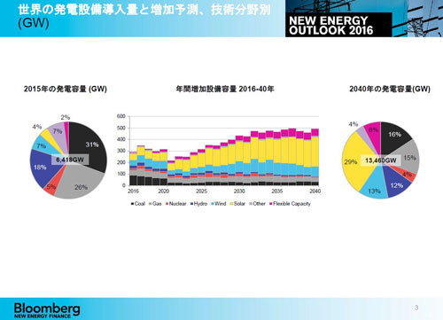 由此,2040年各類電源在整體發(fā)電容量中所占的比例將由2015年的光伏發(fā)電4%、風力發(fā)電7%,大幅增至光伏發(fā)電為29%、風力發(fā)電為13%。