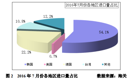 第三,其他地區(qū)月進(jìn)口量日漸增加。7月份從韓、臺、德、美以外的地區(qū)進(jìn)口量達(dá)到1468噸,來自日本、馬來西亞、挪威以及沙特的進(jìn)口量均在200噸以上,尤其是從馬來西亞進(jìn)口量7月份達(dá)到796噸,占總進(jìn)口量的6.6%。綜上,自韓國、臺灣進(jìn)口量長期維持高位,其他地區(qū)進(jìn)口量日漸增加是導(dǎo)致總進(jìn)口量居高不下的主要因素。