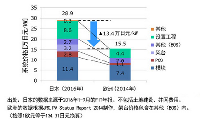 報告書指出,“太陽能電池板與光伏逆變器(PCS)的價格為歐洲的1.7倍等,國際流通商品也存在國內(nèi)外價格差。尤其是住宅用產(chǎn)品,因多余的流通構造,價格高達國際價格的3倍”,提出“要通過促進競爭和開發(fā)技術,逐漸向國際價格靠攏”。還分析道,“工程費和架臺費是歐洲的2.1倍,其原因在于專業(yè)光伏施工企業(yè)少,施工方法等未獲優(yōu)化,因日本特有的抗災和土地環(huán)境,導致工程和架臺費用増加”,提出“可通過優(yōu)化施工方法及技術開發(fā)等途徑,減少這些費用”。