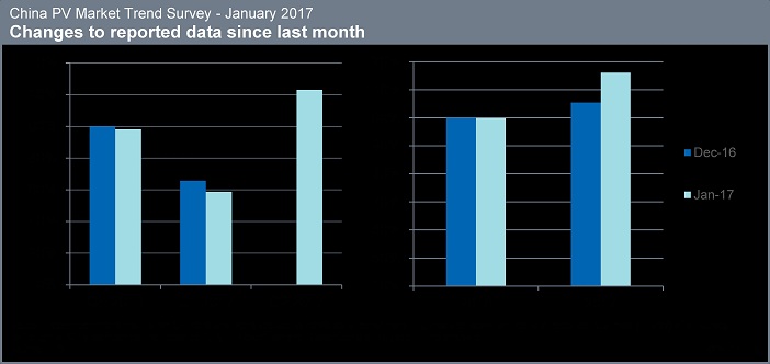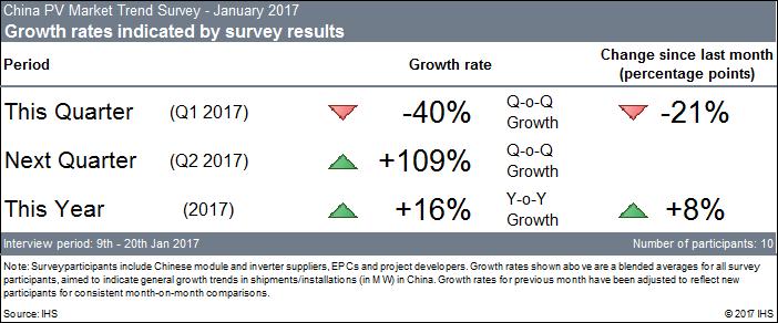 由于凍土期和農(nóng)歷春節(jié)的存在,1季度通常是裝機(jī)淡季。而2017年的1季度會(huì)顯得尤其冷清。IHS Markit認(rèn)為,這同光伏補(bǔ)貼電價(jià)的最終確認(rèn)有關(guān)。中國(guó)2017年的光伏上網(wǎng)補(bǔ)貼電價(jià)終于在2016年12月下旬宣布,大體上符合IHS Markit之前的預(yù)期。而新的630并網(wǎng)節(jié)點(diǎn)也減輕了集成商的壓力,因此會(huì)有相當(dāng)數(shù)量的項(xiàng)目完工期限將從年底推遲到2季度。但由此也會(huì)進(jìn)一步削弱1季度的裝機(jī)量。在1月份的調(diào)查中,2017年1季度的裝機(jī)量比12月的結(jié)果再次下降了21個(gè)百分點(diǎn),達(dá)到了40%的降幅。