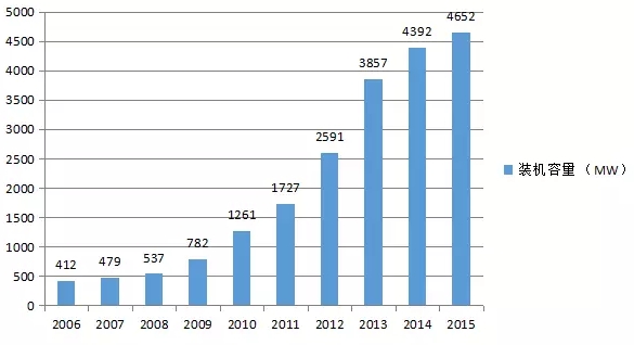 全球太陽(yáng)能熱發(fā)電累計(jì)裝機(jī)容量(2006~2015年),數(shù)據(jù)來(lái)源:IRENA