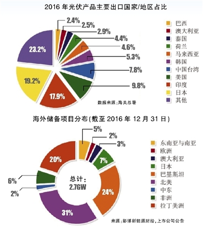 2016年中國(guó)光伏外貿(mào)形勢(shì)并不樂(lè)觀。來(lái)自中國(guó)光伏行業(yè)協(xié)會(huì)的數(shù)據(jù)顯示,2016年我國(guó)光伏產(chǎn)品出口140億美元,同比降10.3%。盡管出口總額收縮,但從貿(mào)易份額上看,中國(guó)光伏產(chǎn)品占世界主要光伏市場(chǎng)的比重仍然很大,月平均出口額為11.7億美元,是中國(guó)外貿(mào)中具有競(jìng)爭(zhēng)力的重要一支。進(jìn)入2017年,隨著光伏補(bǔ)貼機(jī)制下調(diào),國(guó)內(nèi)市場(chǎng)競(jìng)爭(zhēng)加劇,“一帶一路”推進(jìn),國(guó)際市場(chǎng)新興市場(chǎng)規(guī)模發(fā)展,越來(lái)越多的光伏企業(yè)將眼光盯準(zhǔn)海外。