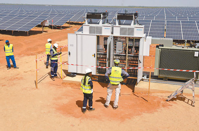 塞內(nèi)加爾博庫爾的一座太陽能光伏發(fā)電站,技術(shù)人員正在對(duì)設(shè)備進(jìn)行調(diào)試。人民視覺