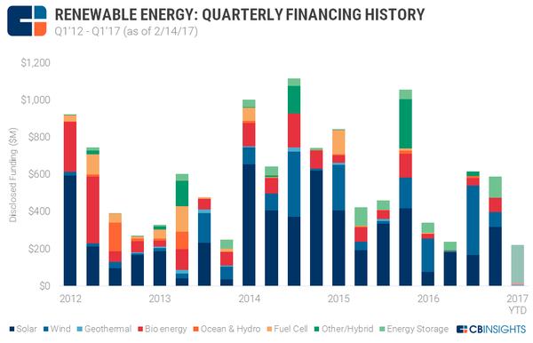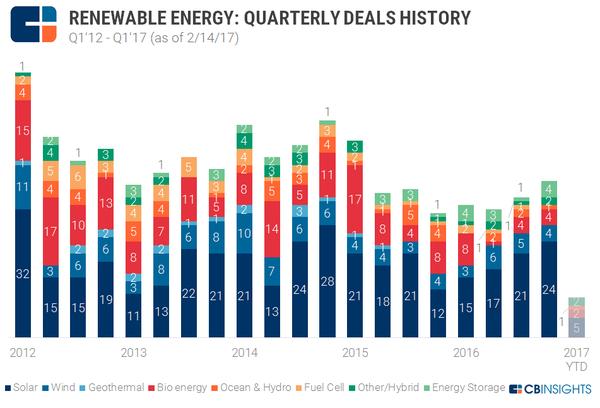 我們利用CB Insights的數(shù)據(jù)分析了自2012年可再生能源領(lǐng)域的投資情況。