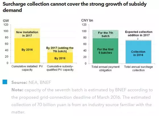 2016年,中國可再生能源基金僅收到700億元附加費,這并不足以覆蓋所有項目的資金補貼需求。據(jù)彭博新能源財經(jīng)估算,在不考慮消納的情況下,如果包括第七批可再生能源補貼目錄,