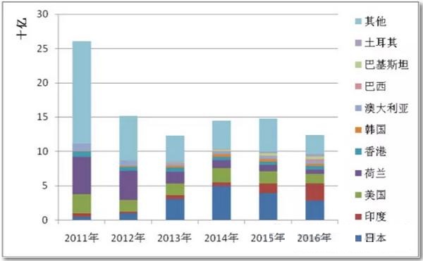 2016年我國對日本和美國兩大市場光伏組件的出口金額進(jìn)一步萎縮,兩國出口額同比分別下降了26.80%和20.33%,其中美國的排名更是跌至第三位;其次,對印度市場的出口高速增長,出口金額占2016年全年出口金額的19.87%,已經(jīng)超越美國成為我國光伏組件出口第二大的市場;另外較突出的一點(diǎn)是巴西、土耳其市場異軍突起,第一次進(jìn)入全年出口額排行榜,并分別位列第8位和第10位。
