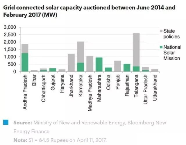 印度的光伏價格正在持續(xù)下降。2016年的最低光伏電價為每度電4.34盧比(折合$64.1 per MWh)。2017年2月,光伏電價繼續(xù)下跌至每度電3.31盧比(折合$49.38 per MWh)。2017年4月11日,Engie公司甚至創(chuàng)下了每度電3.15盧比(折合$48.48 per MWh)的光伏電價新低。