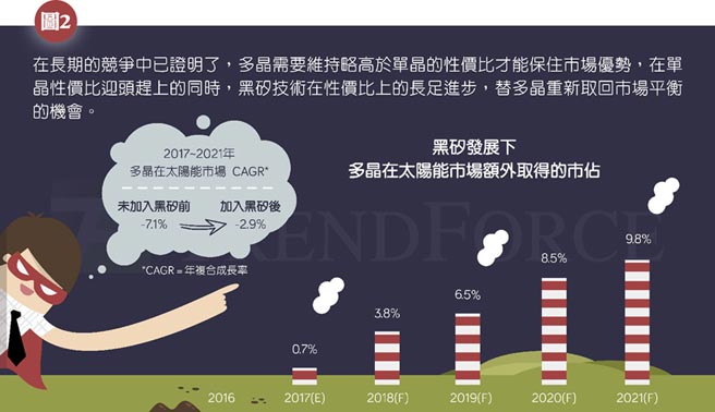 圖2黑硅發(fā)展下多晶在太陽(yáng)能市場(chǎng)額外取得的市占 圖/TrendForce綠能研究中心EnergyTrend