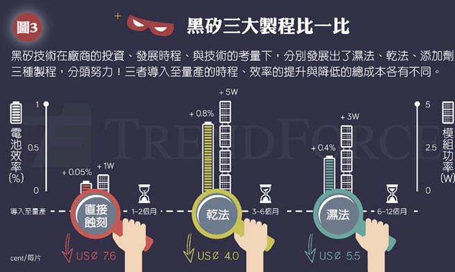 圖3黑硅三大制程比一比 圖/TrendForce綠能研究中心EnergyTrend