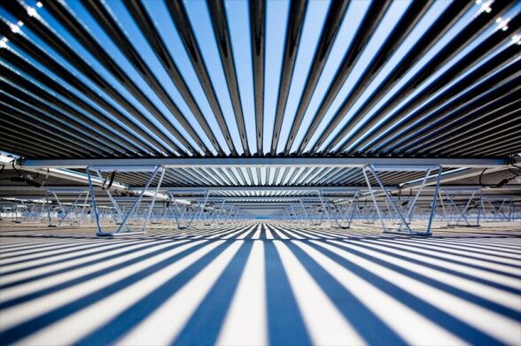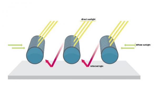 Solyndra的產(chǎn)品概念也是光伏產(chǎn)業(yè)中的奇葩。我們所熟知的太陽能電池都是平板結(jié)構(gòu),北半球的電池板向南傾斜,南半球的電池板向北傾斜,以盡可能多地接收太陽光的輻射。而Solyndra的團(tuán)隊(duì)異想天開地宣稱,把太陽能電池做成圓柱狀,在日升日落的循環(huán)中可以接收到更多的太陽能,就是下面這個(gè)樣子: