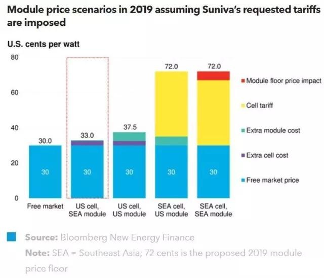 假設(shè)中國公司在美國投建的GW級光伏電池生產(chǎn)廠在2019年投產(chǎn),并將生產(chǎn)的電池運(yùn)往東南亞或墨西哥封裝成組件,則該組件相較于電池和組件都在東南亞完成的情景會產(chǎn)生大約3美分/W的額外費(fèi)用。假設(shè)這筆額外費(fèi)用直接反映在產(chǎn)品售價(jià)上,在美國的組件售價(jià)會被抬高約10%。